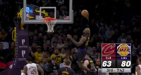 比赛第三节,里夫斯反击轻巧一抛,詹姆斯高高跃起炸裂劈扣。