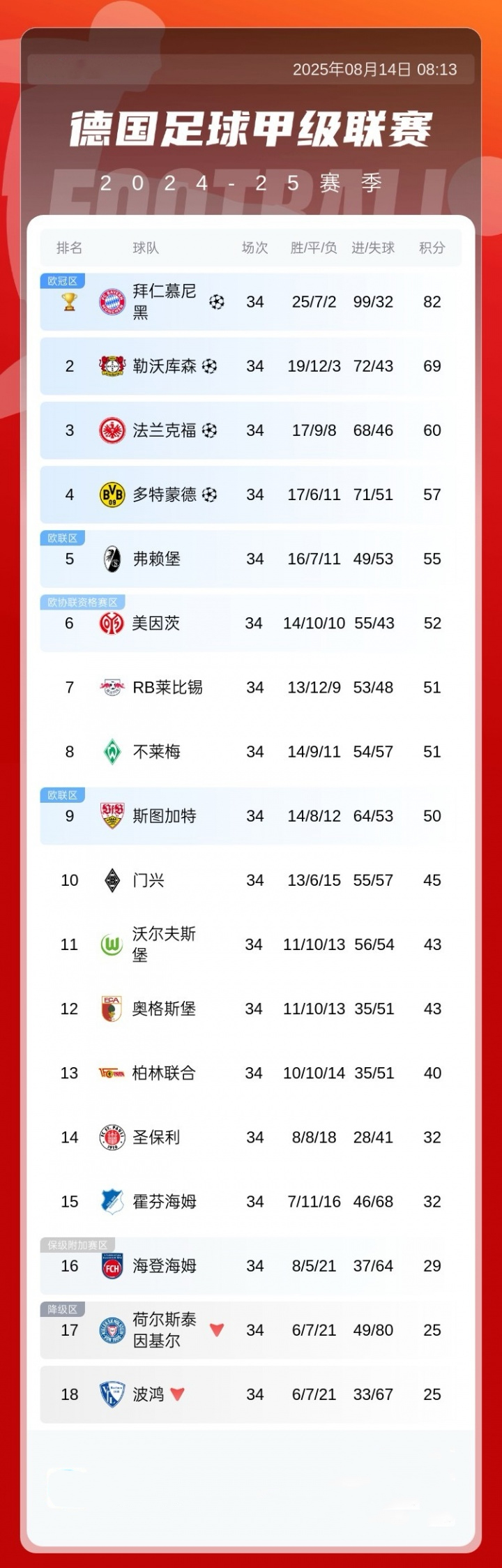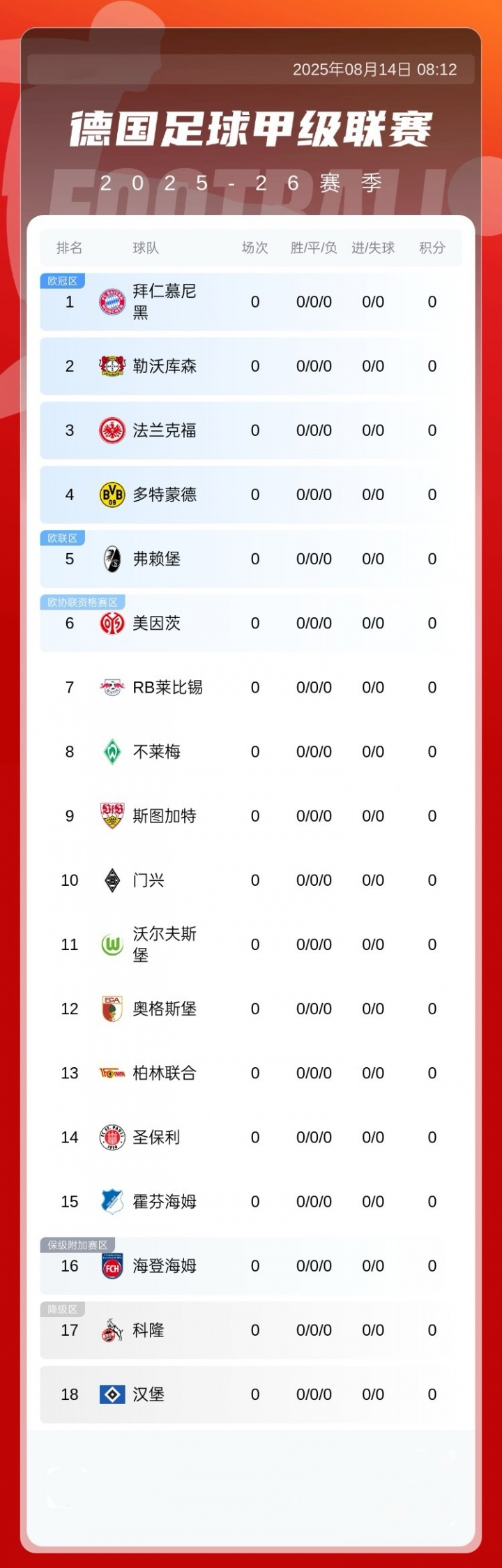 25/26赛季德甲18队:拜仁慕尼黑、勒沃库森、法兰克福、多特蒙德、弗赖堡、美因茨、RB莱比锡、不莱梅、斯图加特、门兴、沃尔夫斯堡、奥格斯堡、柏林联合、圣保利、霍芬海姆、海登海姆、科隆、汉堡