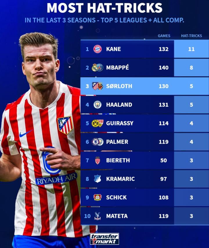 过去三年五大联赛中,帽子戏法次数最多的球员是:
