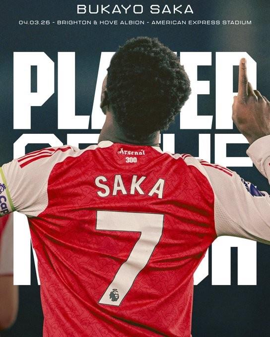 今天凌晨的英超,阿森纳客场1-0拿下布莱顿,萨卡打进了全场那个关键球,赛后枪手官方把队内最佳球员给了他。