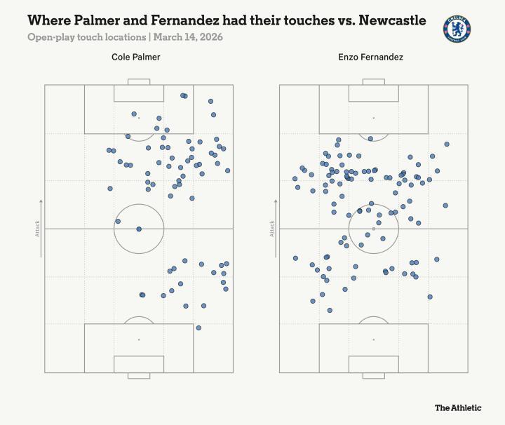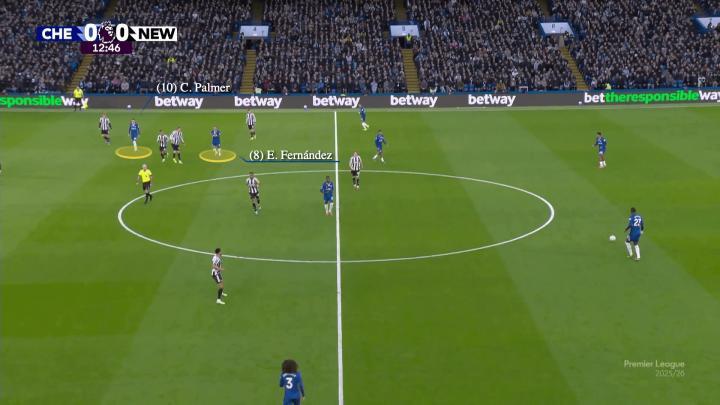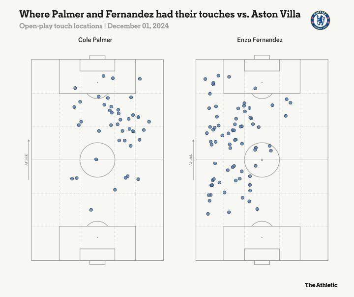 在那场对阵维拉的比赛中,他们各自影响力范围有着自然的平衡,帕尔默主要在球场右侧触球,费尔南德斯在左侧: