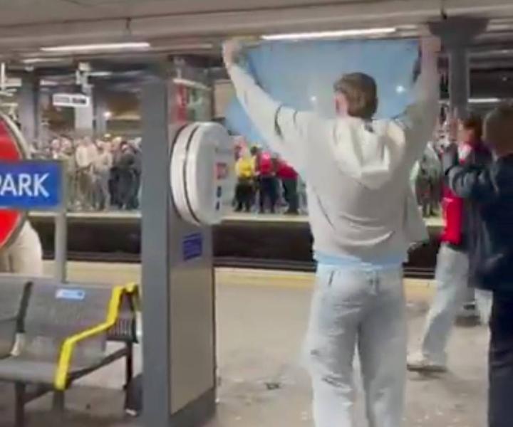 视频显示,多名曼城球迷聚集在温布利公园地铁站,对相邻站台的阿森纳球迷放声高歌。他们高唱的歌词主要是“Second again, ole ole!”,意为“你们又是第二名,哦嘞哦嘞!”