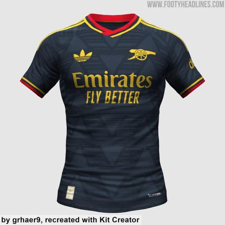 4月5日,足球装备网站Footyheadlines曝光了阿森纳2026-27赛季客场球衣的更多细节。这件球衣以深海军蓝为主色,搭配红黄点缀,设计灵感来自俱乐部经典的历史球衣风格。