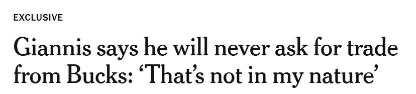 字母哥:没错,绝对不会。我全身心投入,一心扑在篮球事业上,和球队并肩作战,接受当下的一切处境。仅此而已。在这个世界上,我永远不可能放弃我的球队。这不是我的本性。