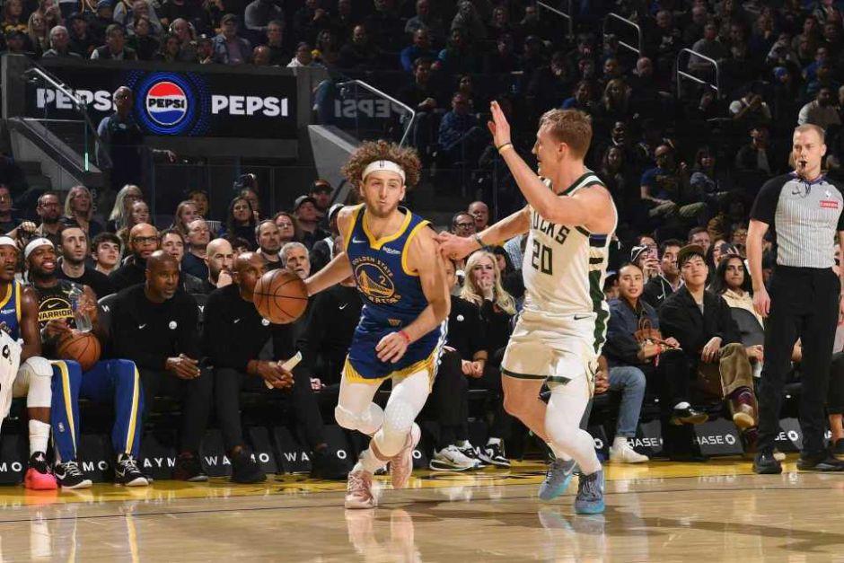 勇士上一场客场102-103惜败快船,雄鹿过去两场连赢黄蜂与国王收获2连胜,本赛季首次交锋勇士客场110-120输给雄鹿。本场雄鹿缺少普林斯,勇士缺少小库里、小佩顿与克赖尔。首节开局双方交替领先缠斗至,勇士在12-10领先后,被雄鹿一波9-1攻势反超6分。库里内外开花引领一波9-0攻势夺回领先,梅尔顿随后也三分命中扩大优势,雄鹿反扑追到差2分。波斯特勾手命中,雄鹿一波6-2攻势扳平,双方首节维持31-31。首节雄鹿21中13超过6成准星,其中三分9中3,字母哥5中3得到7分与小波特9分;勇士22中13接近6成准星,其中三分11中4,库里6中4得到10分4助攻与波斯特3中3得到7分。
