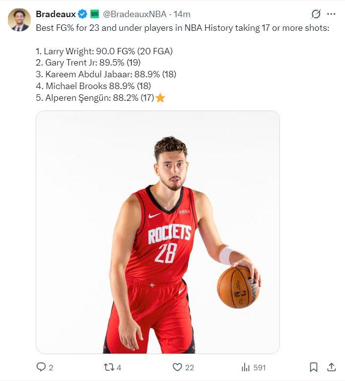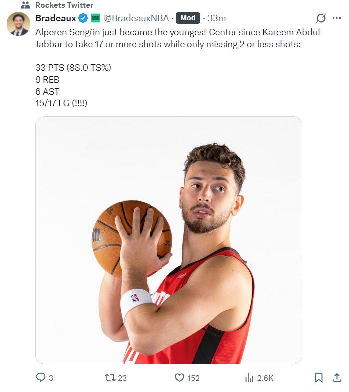 申京在比赛中17投15中,这表现引起了热议。他创造了四项纪录,甚至与“大梦”奥拉朱旺相媲美。有趣的是,他成为了自贾巴尔以来,最年轻的在至少出手17次的情况下只丢了2球的中锋。很多人认为他已经是联盟前五的中锋,火箭队也视他为非卖品。