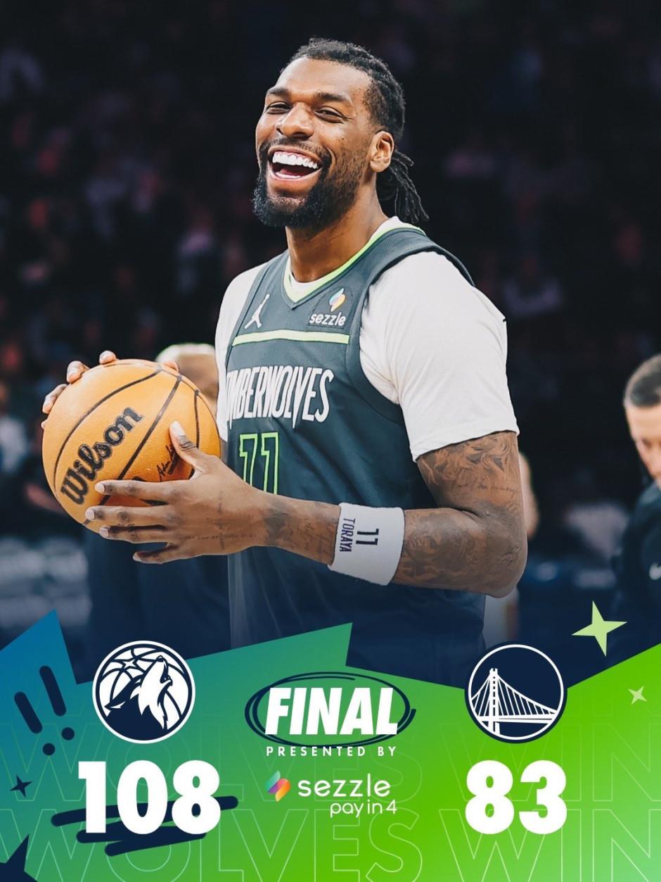 - NBA勇士vs森林狼战报:勇士83-108不敌森林狼,兰德尔贡献18分7篮板2助攻