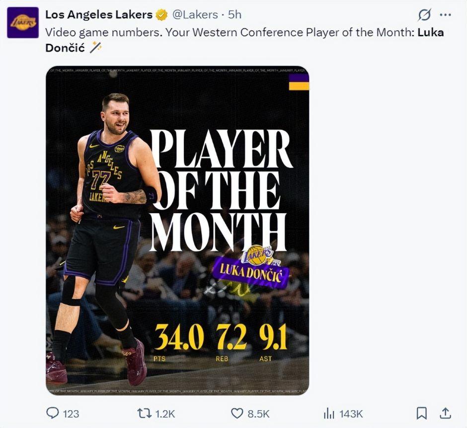 东契奇成为西部月最佳球员,场均34分9.1助攻7.2篮板。