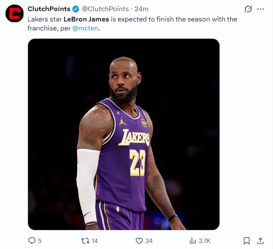 在这场比赛打到第二节,根据马克-斯坦恩的报道,詹姆斯在本赛季交易截止日不会被交易,他将继续代表湖人出战。