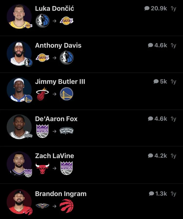 Real App的这份交易总结当中包括,戴维斯和东契奇的互换交易,巴特勒被交易至勇士,福克斯被送至马刺,拉文加盟国王,英格拉姆转战猛龙。