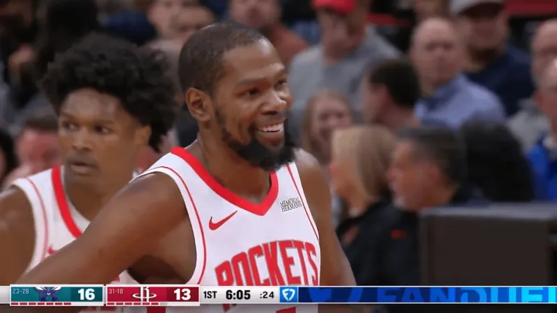 美媒晒出火箭和黄蜂比赛片段:“拉梅洛-鲍尔在比赛中提醒杜兰特“不传球”,杜兰特觉得这很有趣笑笑回应。”