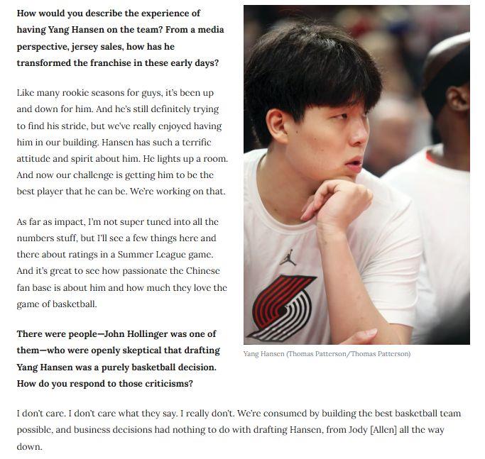 2月19日,北京时间,开拓者总经理克罗宁接受了wweek媒体的采访,谈及球队的多个话题,其中提到了杨瀚森。他表示,选择杨瀚森完全是看中了他的潜力,球队将全力支持他的成长,希望把他培养成顶尖球员。
