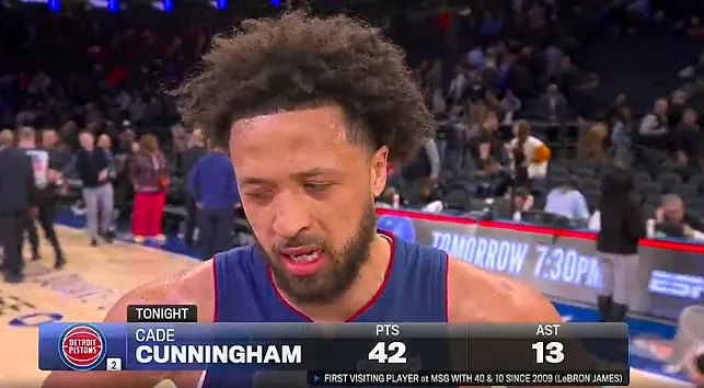 根据数据统计,坎宁安在尼克斯主场麦迪逊花园广场砍下40 10,自09年詹姆斯以来首位做到的客场球员。