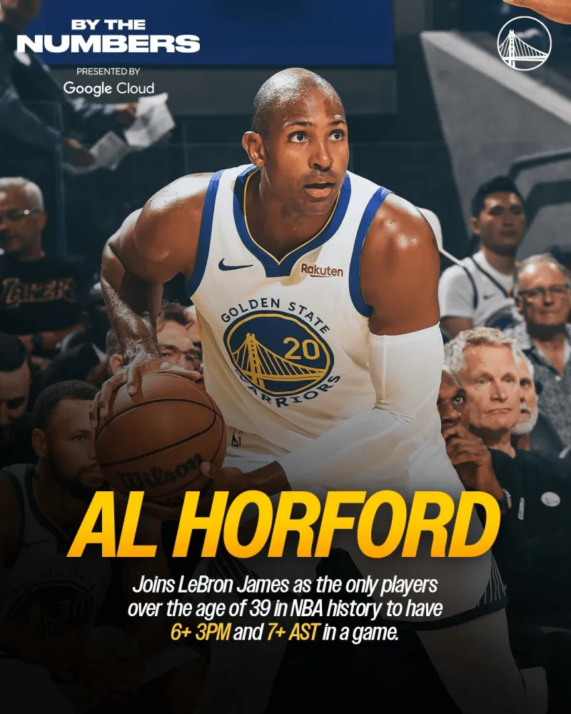 勇士官方分享数据:霍福德加入勒布朗-詹姆斯的行列,成为NBA历史上唯二在39岁后还能单场投进6记三分且送出7次助攻的球员。