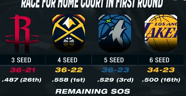 白热化,火箭剩余赛程难度排名第二十六,掘金第一,湖人第十六