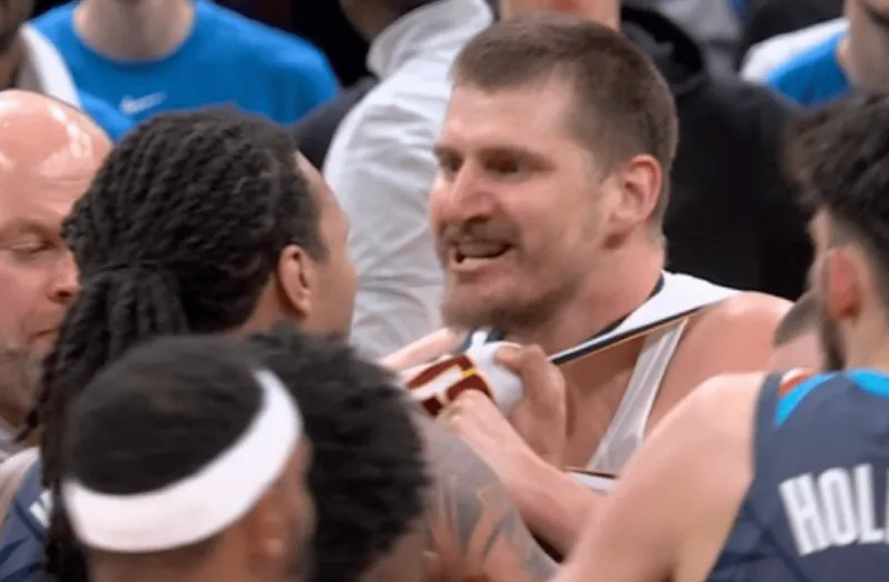 比赛第四节,雷霆球员吕冈茨-多尔特绊倒掘金球员尼古拉-约基奇,随后约基奇与其愤怒对峙,雷霆球员杰林-威廉姆斯为多尔特出头,双方怒目圆睁。