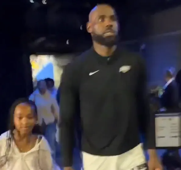 詹姆斯牵着女儿的手走出球馆,微笑着指向她:我的幸运星就在这