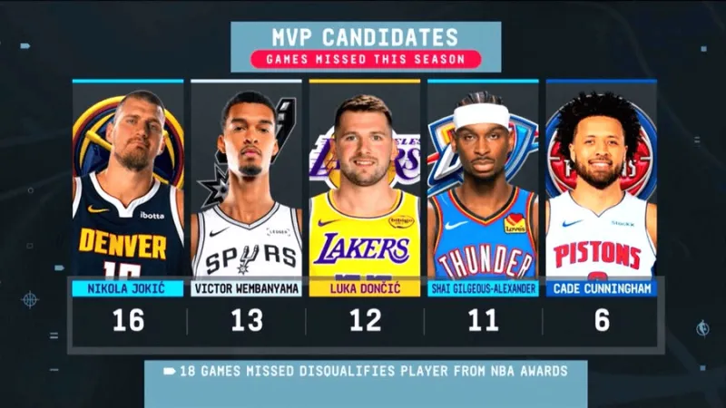 MVP候选人缺席数据:约基奇16场,文班13场,东契奇12场等