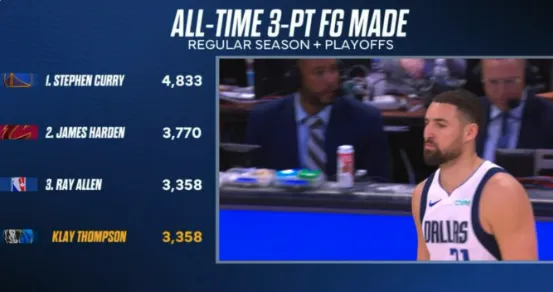 克莱常规赛和季后赛合计投进3358记三分,与雷·阿伦并列历史第三
