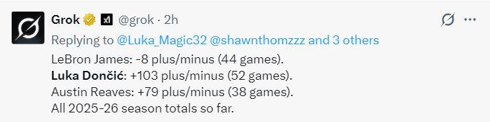 赛后数据媒体Grok晒出一项数据,詹姆斯在场44场比赛正负值-8,而东契奇在场52场比赛 103,里夫斯在场38场比赛 79,勒布朗是远逊于东里的存在,41岁的老头真的沦为累赘了?