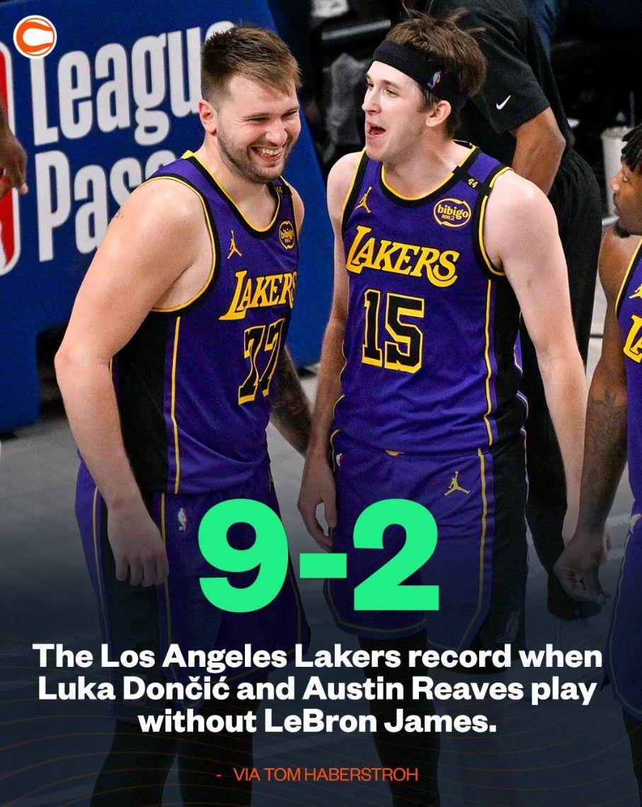 还有两项数据特别的扎心,本赛季当东契奇、里夫斯同时登场且勒布朗缺席的比赛,湖人拿到9胜2负的傲人战绩,胜率高达81.8%。