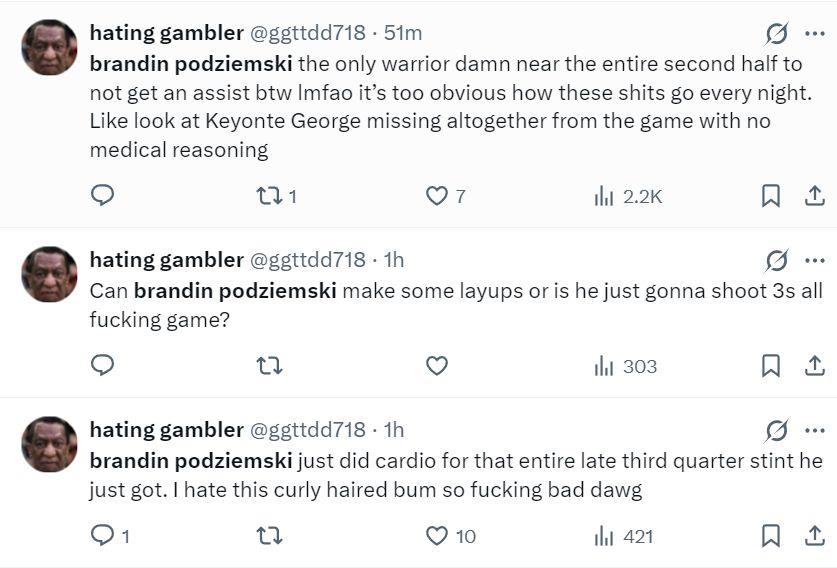 勇士球迷实在是忍无可忍的开喷了:波杰姆斯基这个家伙整个下半场就1次助攻简直太离谱了,这家伙为了数据每一晚的套路实在是太明显了令人想笑。完全不懂突破,只会在外面飘着投篮,我真XX的讨厌这个卷发的混蛋。