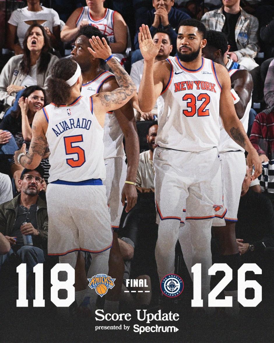 尼克斯方面:唐斯35分12板7助、布伦森28分4板8助、阿努诺比22分6板2助2断、哈特12分13板3助、沙梅特9分1板、布里奇斯7分7板4助2断、迪亚瓦拉5分4板2助、胡克波尔蒂3板1助、阿尔瓦拉多1板3助、克拉克森1助、科勒克1助