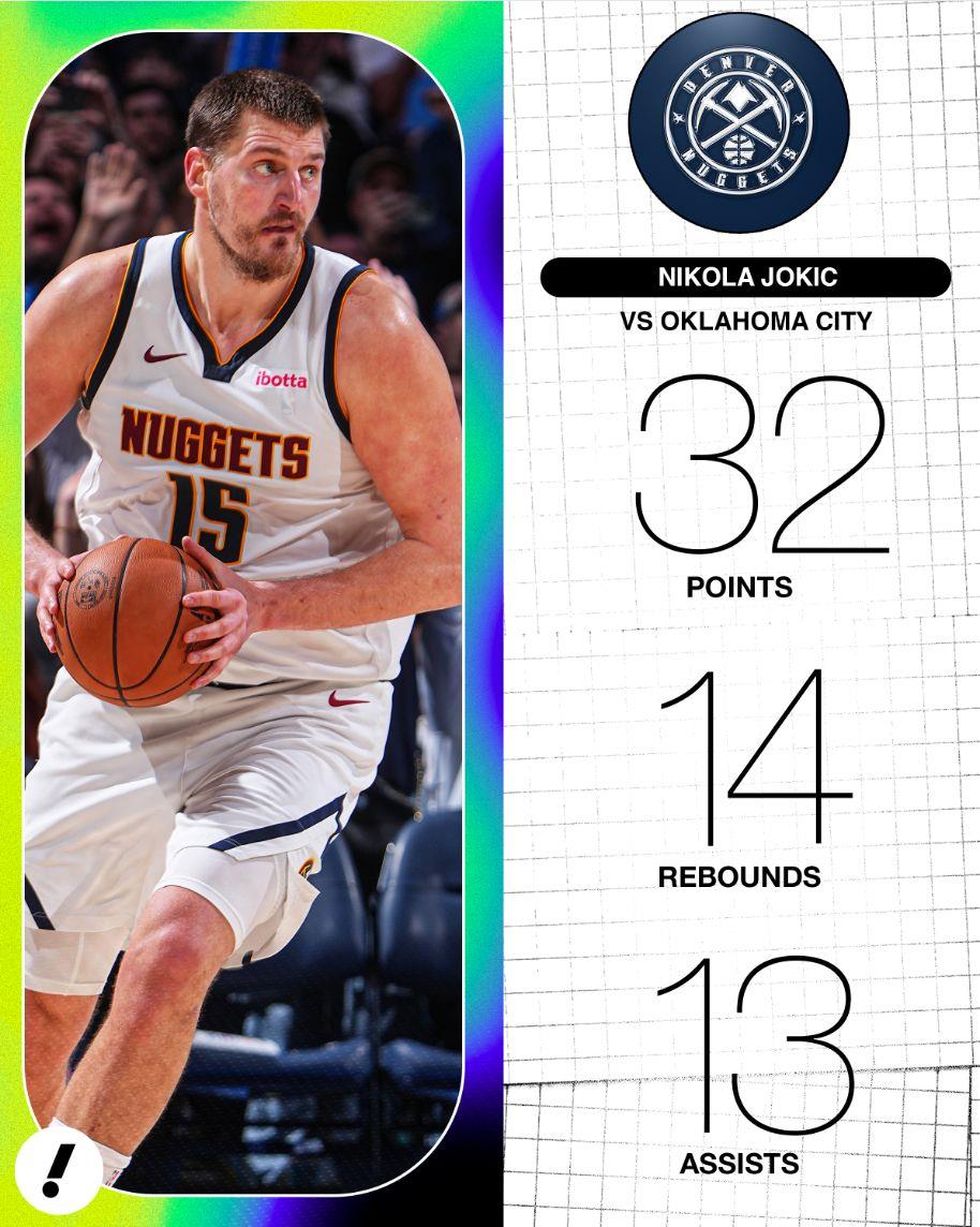 全场比赛约基奇40分钟,19中12,三分6中3,罚球6中5,拿到32分14篮板13助攻1盖帽,命中率63.2%,三分命中率50%,正负值 2。