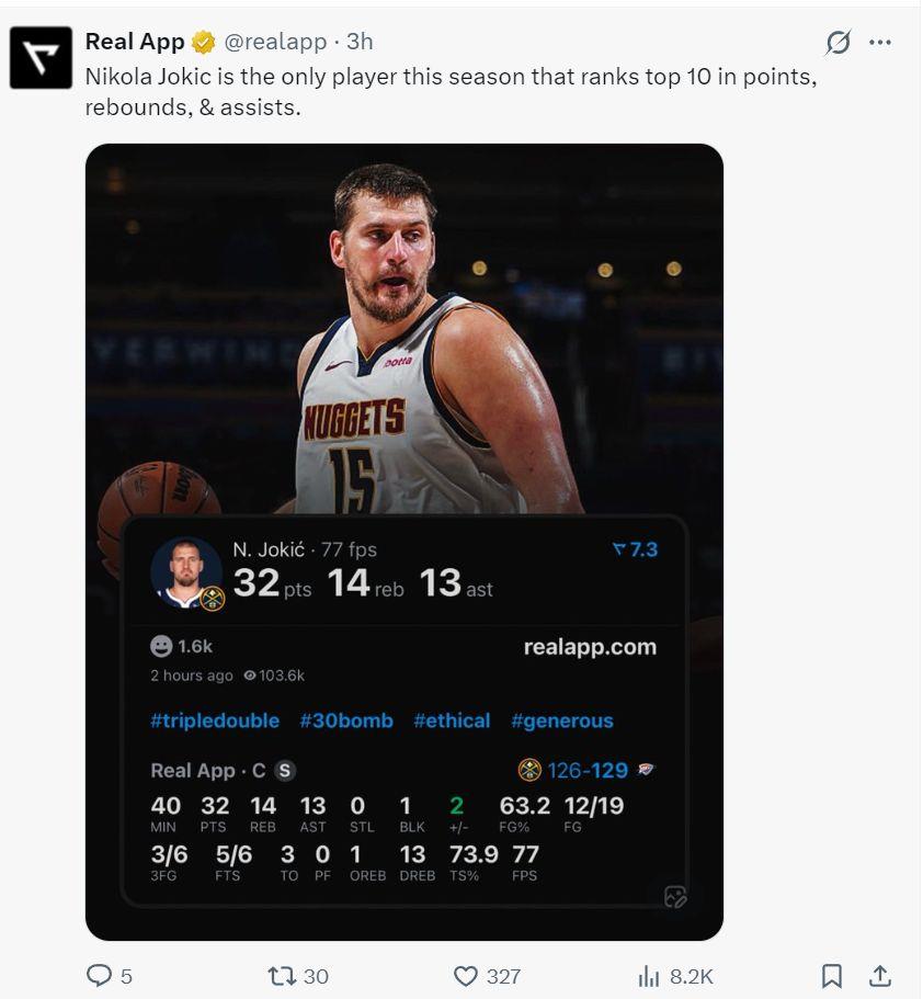 2.约基奇是联盟唯一一位得分、篮板、助攻都是联盟前十的球员;