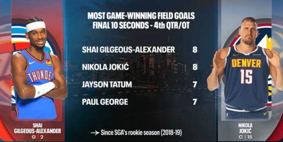 自SGA进入联盟后,在终场前10秒内完成准绝杀/绝杀次数最多的球员是约基奇、SGA,这两人都是8次,所以关键球能力约基奇也不输亚历山大。