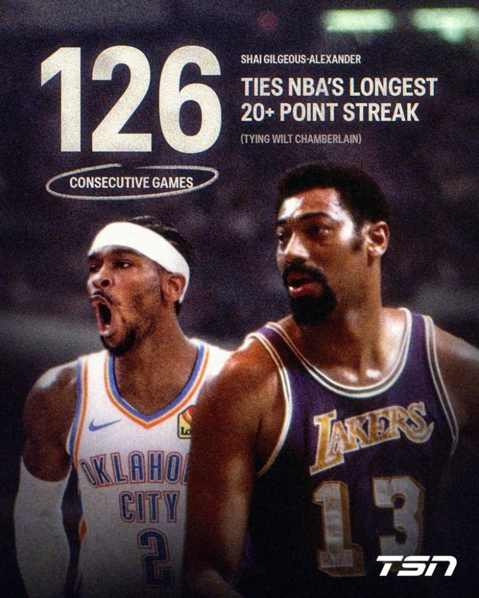 亚历山大已经证明:队友越少,他反而越强,并能带队击败强敌。掘金是少数能威胁雷霆卫冕的球队,而亚历山大以残阵击败了他们。他还连续126场比赛得分20 ,追平了张伯伦的神迹,下一场就能创造新的纪录。