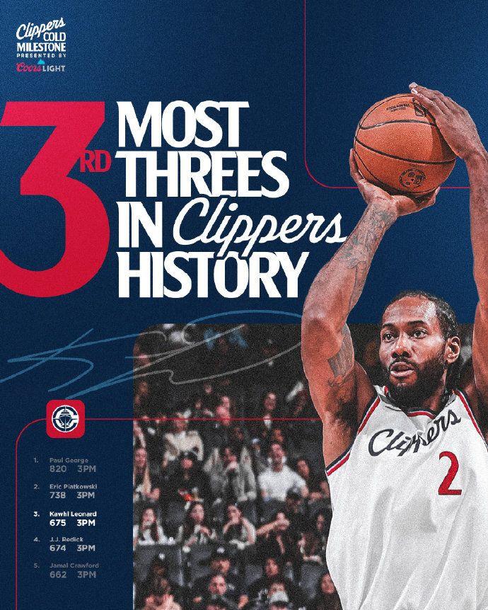 莱昂纳德快船生涯三分命中数超越雷迪克,升至快船队史第3位迎来里程碑,仅次于乔治与布莱德索。