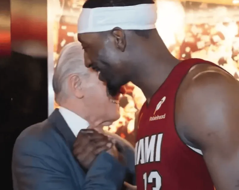 热火官方发布了一段阿德巴约走回更衣室的视频,视频中,热火总裁帕特-莱利在球员通道等待阿德巴约,与他拥抱并说道:
