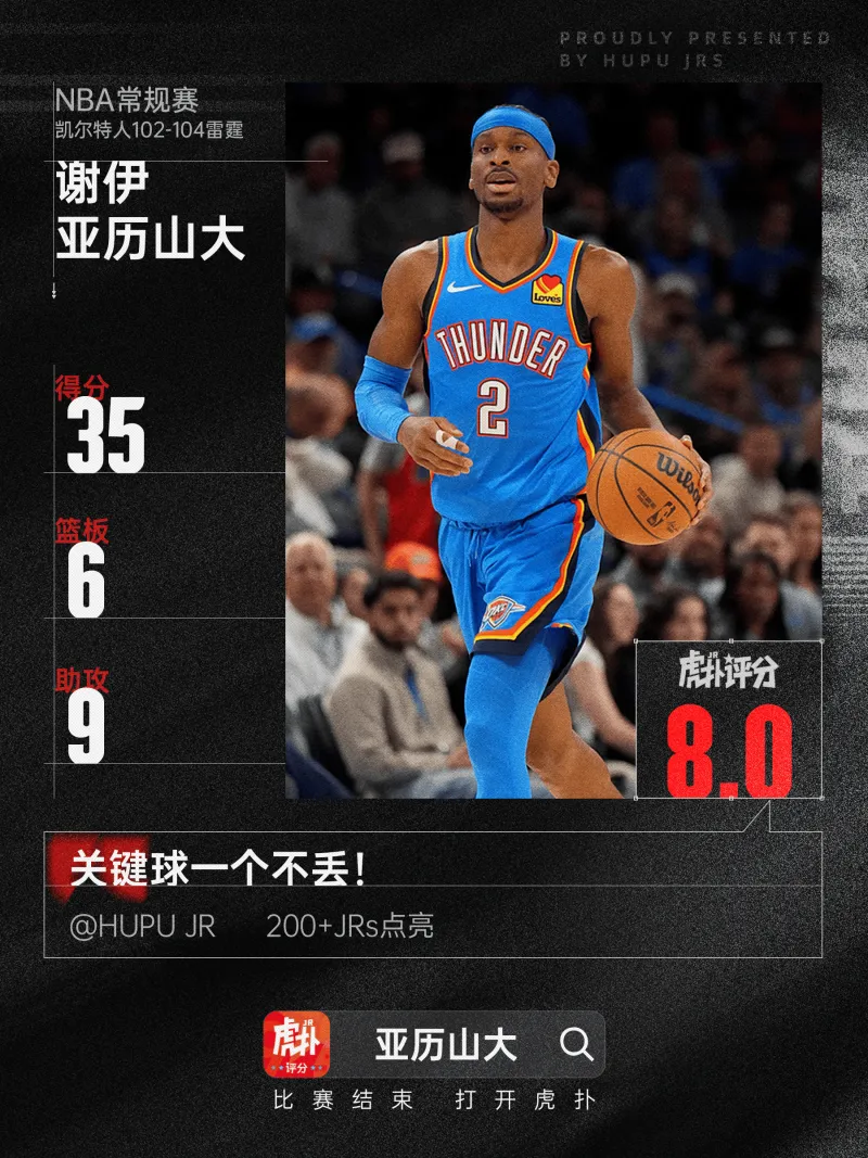 亚历山大这场真是打疯了,在雷霆跟凯尔特人的比赛里,他一个人拿了35分,还抓了6个篮板,送出9次助攻,外加2个抢断和3记盖帽,这数据太全面了,最后雷霆在主场104比102险胜对手。