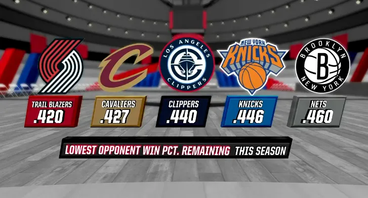 剩余赛程最轻松的前五球队,开拓者骑士快船尼克斯篮网