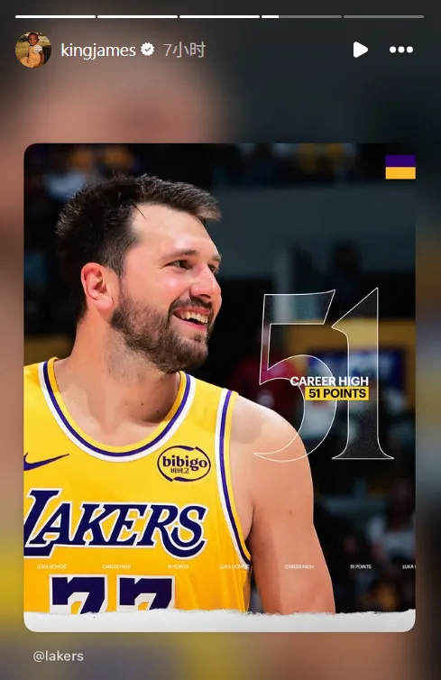 赛后,勒布朗-詹姆斯ins转发了东契奇51分的海报。