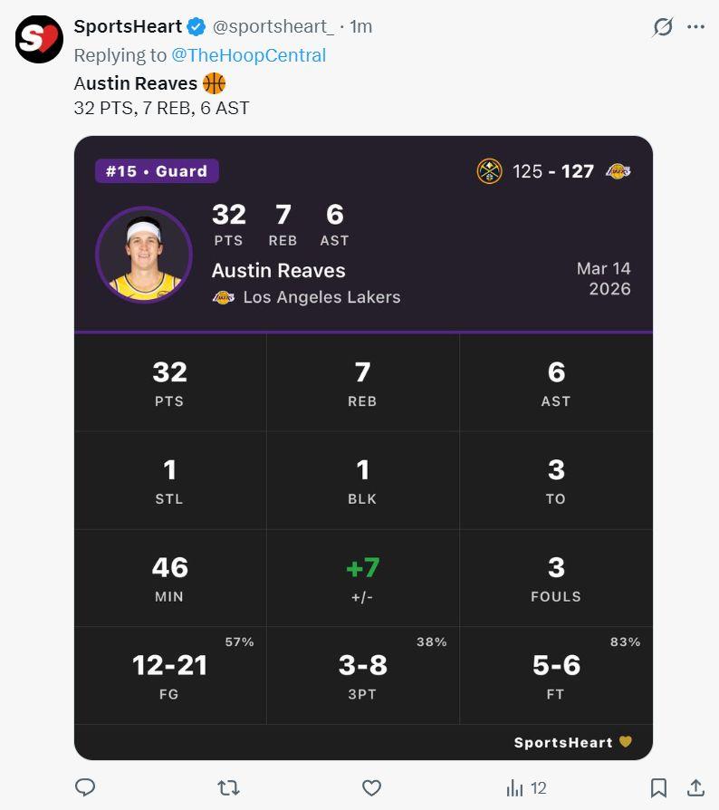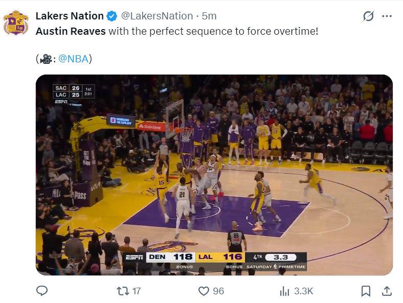 《湖人国度》回顾了奥斯汀-里夫斯这最后时刻的极限操作,终场前5秒罚球第一罚命中,3.3秒第二罚不中里夫斯自己拼下前场篮板,这个反弹球太惊人了,随后里夫斯抛投命中只给掘金留下1.9秒,这也算是准绝平了。