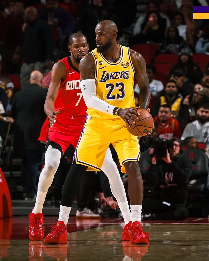 赛后,湖人官方晒出詹姆斯和KD对位的赛场照与球迷分享。