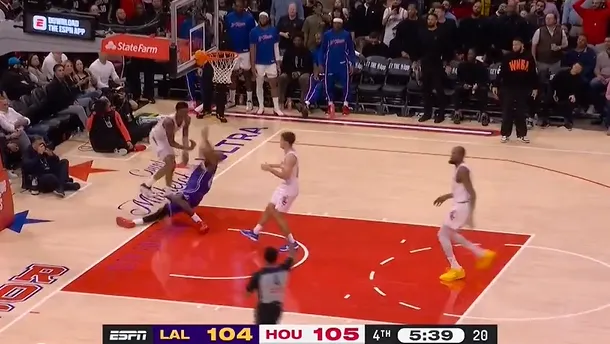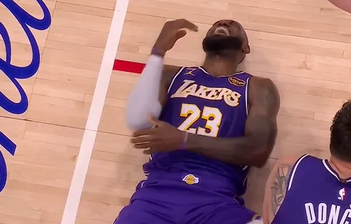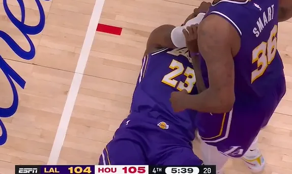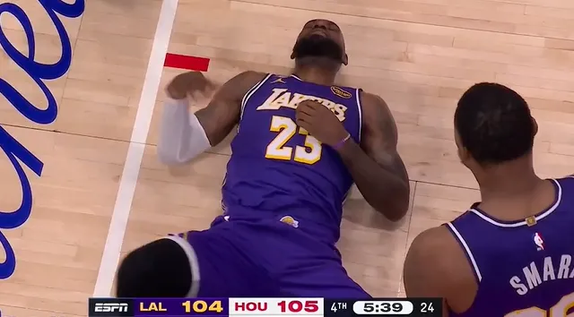 詹姆斯快攻扣篮遭史密斯抱摔,手肘着地表情痛苦