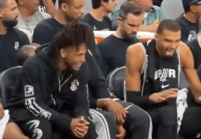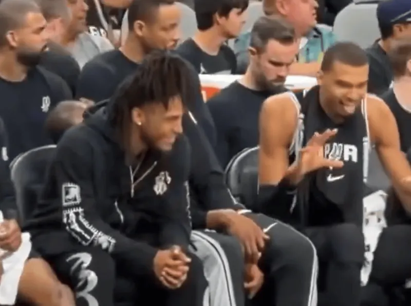 焦点体育03月23日讯,美媒BasketballNews分享了马刺昨日主场击败步行者的比赛花絮,文班在替补席上与卡斯尔互动,搞怪模仿小狗吐舌,场面轻松有趣,欢乐氛围满满。
