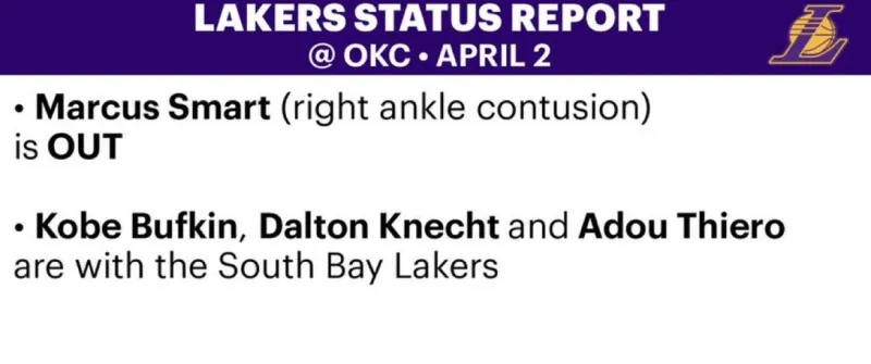 焦点体育04月02日讯,湖人将在明日NBA常规赛中迎战雷霆,马库斯-斯马特因伤无法出战这场比赛。