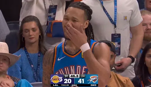 雷霆打湖人这场球,阿杰伊-米切尔三分投进,第一节打完,雷霆44比21,领先了湖人23分。