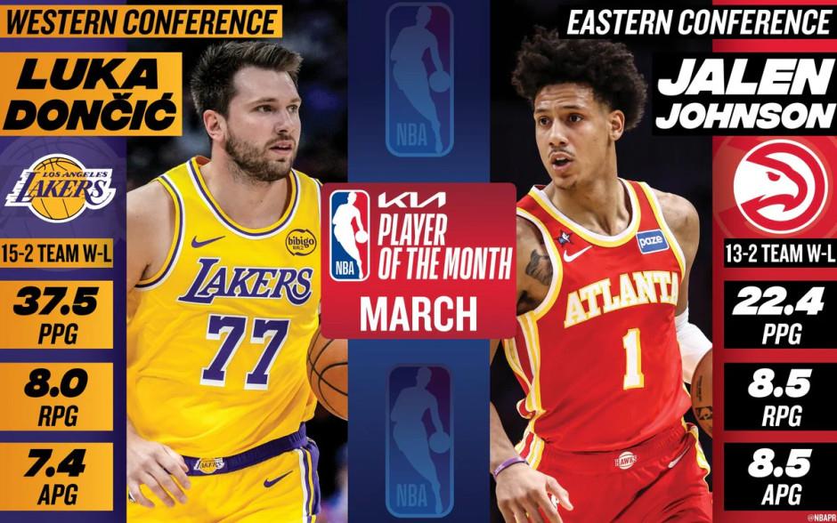 NBA官方宣布,杰伦·约翰逊和东契奇荣膺3月东西部最佳球员