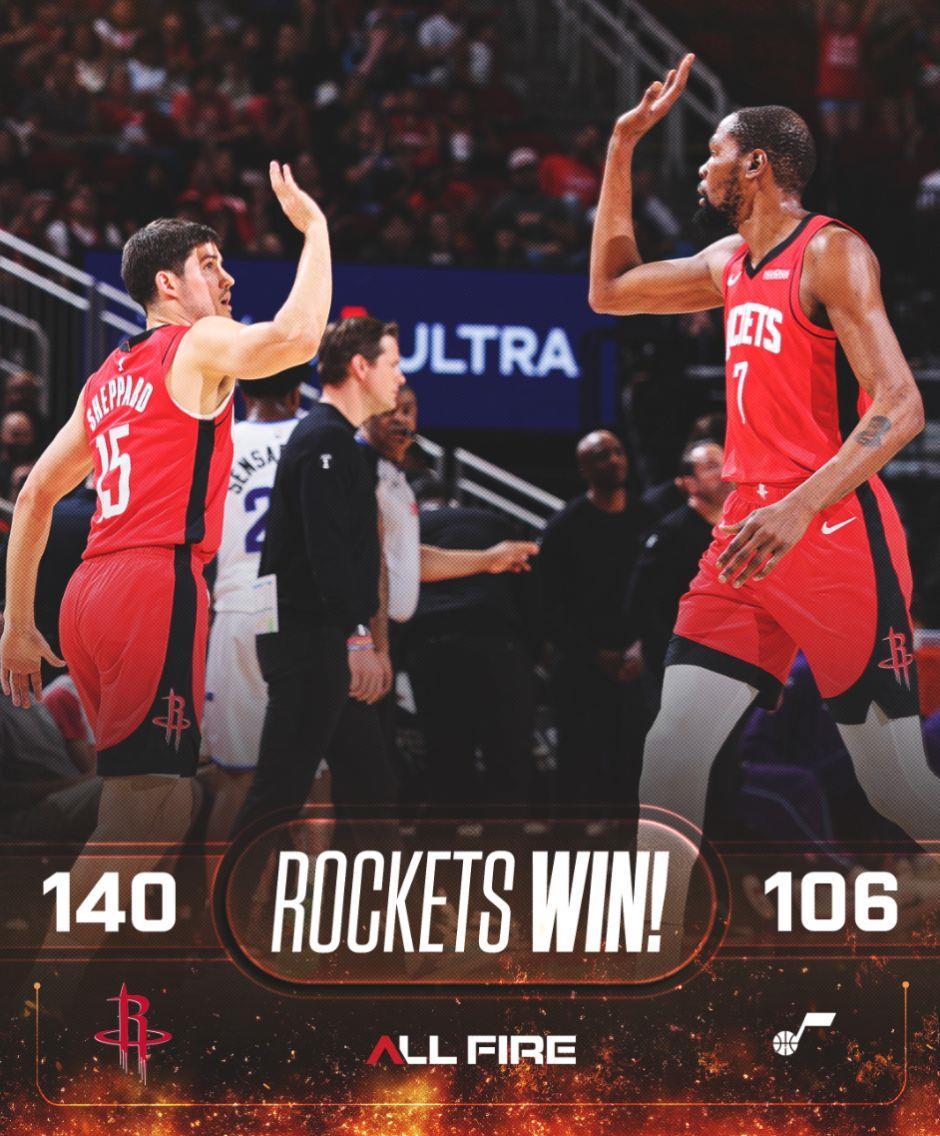 火箭队140-106大胜爵士后已经豪取五连胜,这场比赛火箭多位核心都是三节打卡,全队是6人上双,杜兰特在场下疯狂为球队第二阵容挥毛巾,火箭队拿到一波五连胜后已经跟西部第六的森林狼拉开2个胜场。