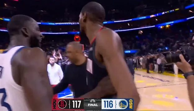 焦点体育04月06日讯,NBA常规赛火箭客场挑战勇士的比赛刚刚落幕,火箭以117-116险胜勇士。赛后,杜兰特与库里、追梦在场边热情寒暄,老友相见气氛融洽。