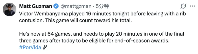 马刺记者Matt Guzman表示,文班亚马本场出战了16分钟,将计入他的总出场次数。
