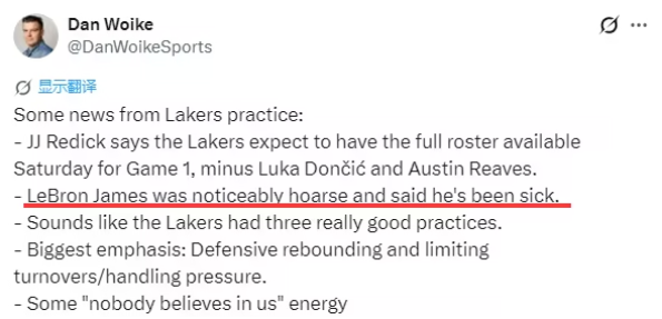 北京时间4月17日,NBA季后赛即将开打,湖人首轮对阵火箭。东契奇、里夫斯养伤,詹姆斯连续三天带队备战,今日训练后声音沙哑透露生病,带病坚持。