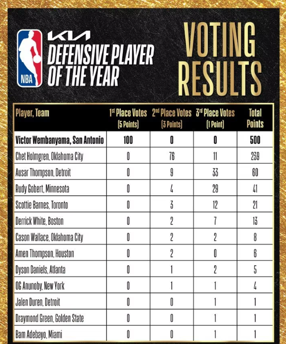 此前接受采访时,文班亚马就曾自信表态:如果无法全票当选年度最佳防守球员,我会感到意外。这位马刺核心不仅稳定领跑最佳防守球员榜单,更重新定义了一名防守球员所能达到的统治级别。