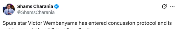 北京时间4月22日,NBA季后赛,马刺主场对阵开拓者,文班第二节伤退返回更衣室。据名记Shams,文班亚马已进入脑震荡保护程序,本场比赛不会回归。