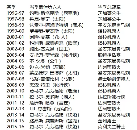 回顾NBA历史,上一位在得奖当年随队夺冠的最佳第六人,已经是1995-96赛季公牛的托尼-库科奇。从那之后的29年间,最佳第六人就像被施予了魔法一般,和总冠军再也挂不上钩。凯尔登-约翰逊今年获奖,马刺能否打破29年的魔咒?